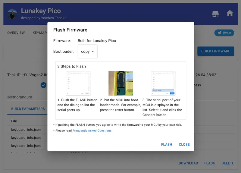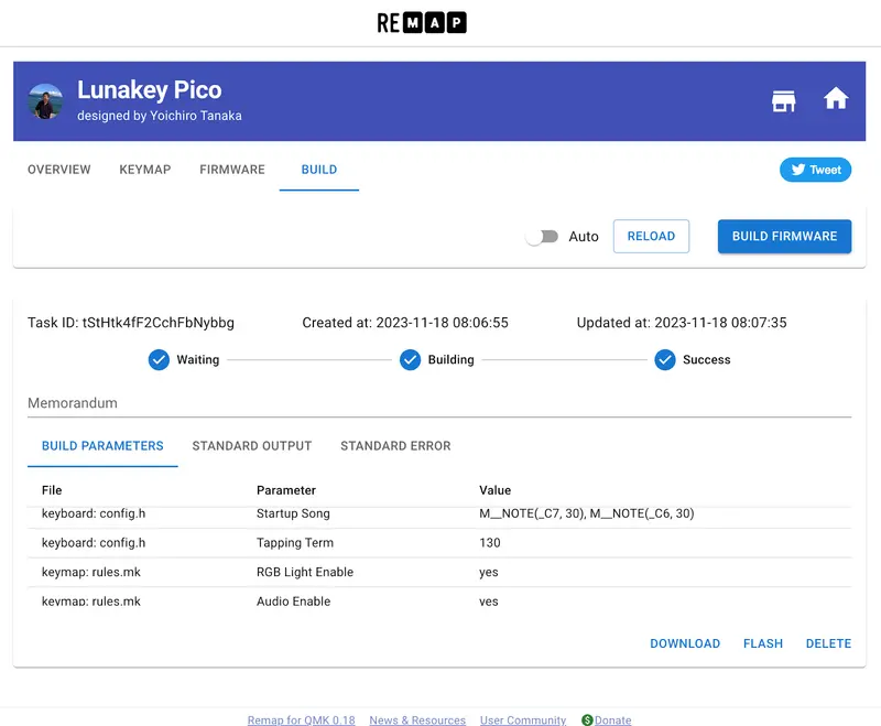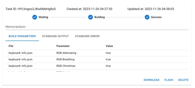 無事ビルドに成功すると、「DOWNLOAD」ボタンや「FLASH」ボタンが表示されます。DOWNLOAD ボタンを押すことで、ビルドされたファームウェアのファイルをダウンロードすることができます。また、FLASH ボタンを押すことで、MCU にビルドされたファームウェアを書き込むことができます。