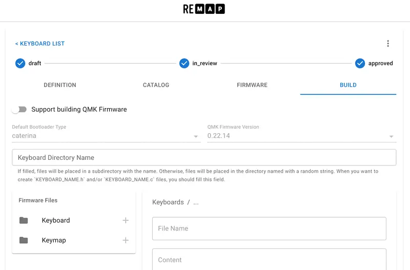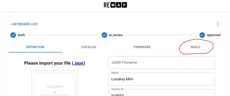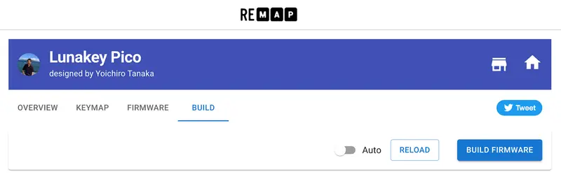 Remap にキーボード登録申請を出して、すでにそれが承認されていることが、ファームウェアビルド機能を利用する前提となります。