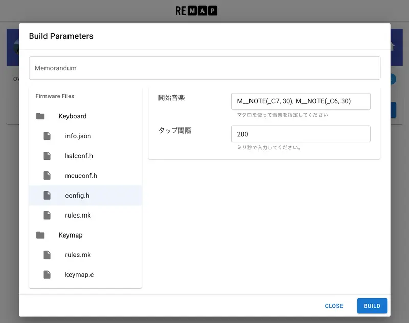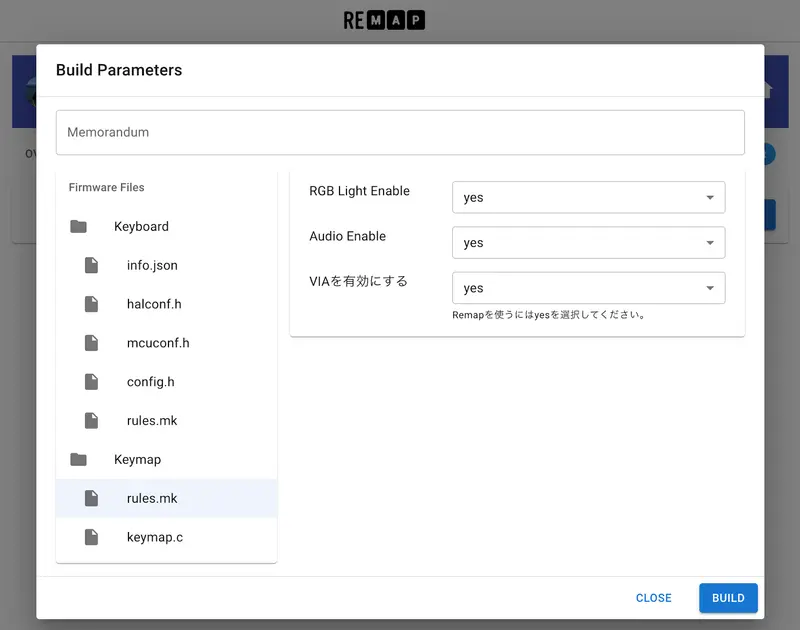 ファームウェアのファイルが登録されたキーボードは、Remap のキーボードカタログのページにて、BUILD タブからファームウェアのビルドができるようになっています。