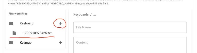 ファイルを登録するには、まず keyboard ディレクトリもしくは keymap ディレクトリのそれぞれ右にある「+」アイコンをクリックします。